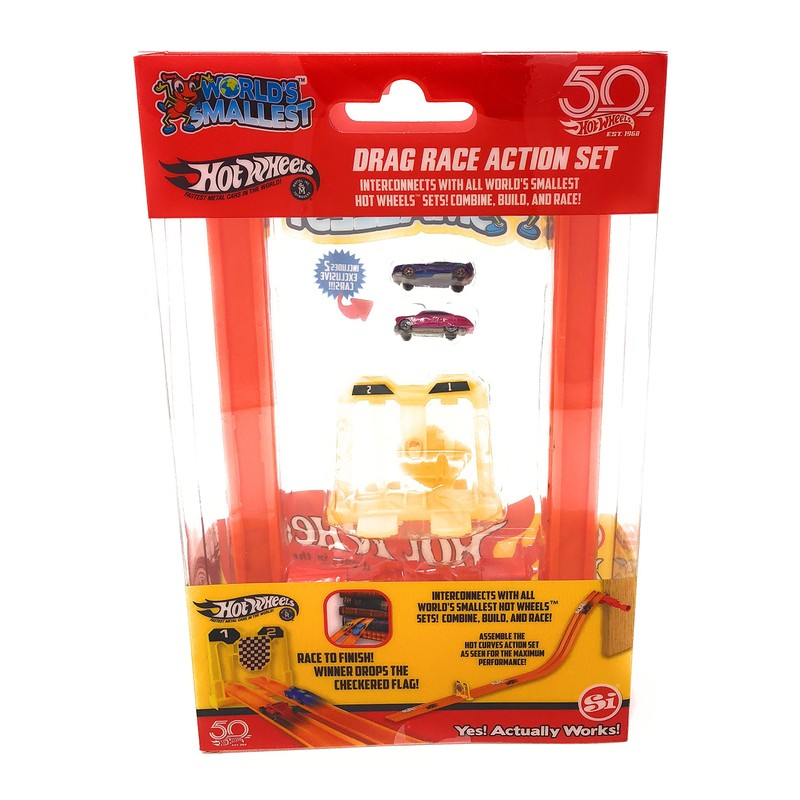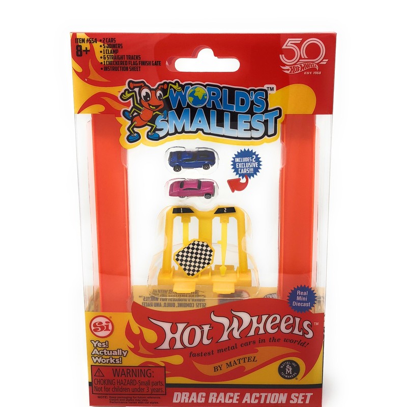 On your mark, get set, go! New from the world of mini Hot Wheels, race down the track, across the straight-away to the finish gate. Winner drops the checkered flag! Includes two World's Smallest Hot Wheels cars. Let your inner daredevil loose with this build-for-speed mini set!