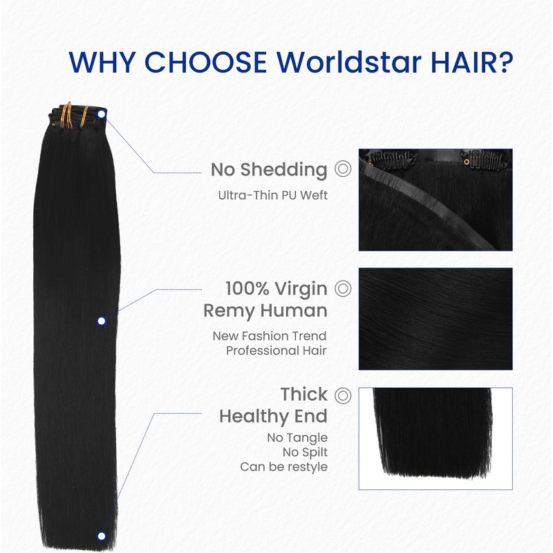 - Seamless Clip In Hair Extensions Real Human Hair:Worldstar Invisible and comfortable seamless clip in hair extensions are made with high-quality virgin human hair, which feels ultra soft and retains the inherit tenacity of natural hair,no shedding, no tangling