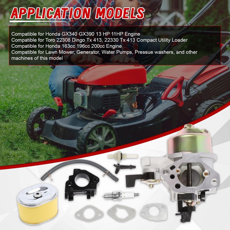 - Applicable Models: Carburetor kit is replacement for Honda GX340 GX390 13 HP 11HP Engine. Replacement for Toro 22308 Dingo Tx 413, 22330 Tx 413 Compact Utility Loader. Replacement for Lawn Mower, Generator, Water Pumps, Pressue washers, and other machines of this model.