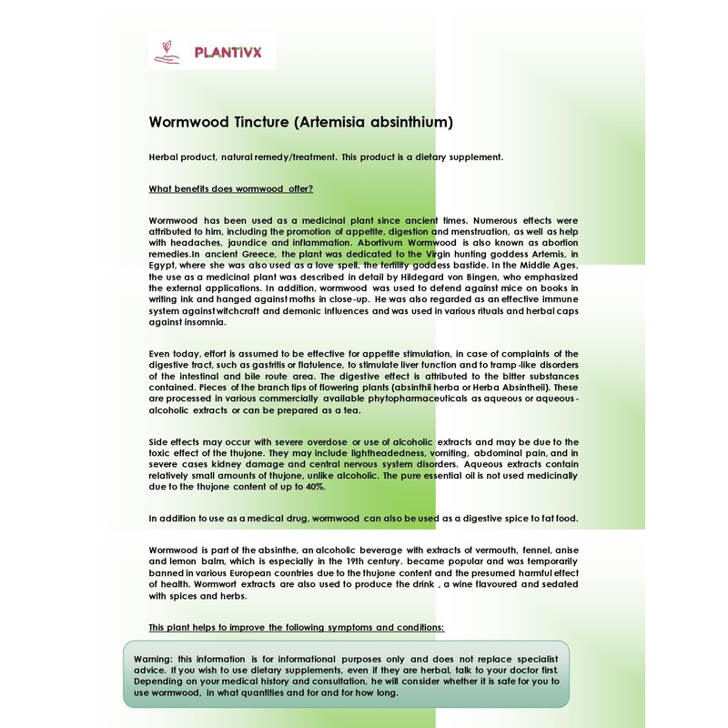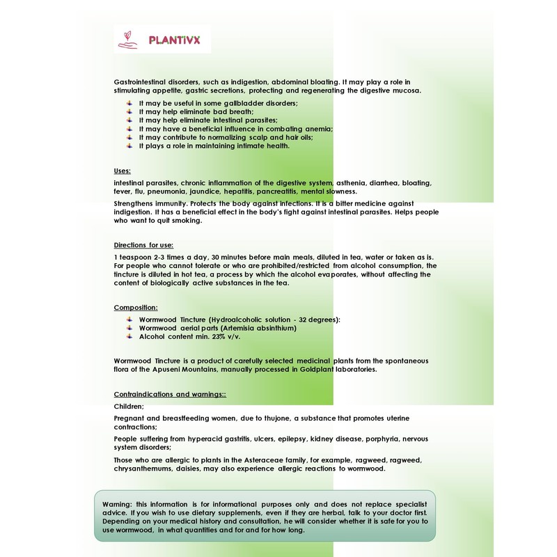 • Ingredients: wormwood roots (Artemisia absinthium) - 20%; ethyl alcohol min. 30% v/v.
