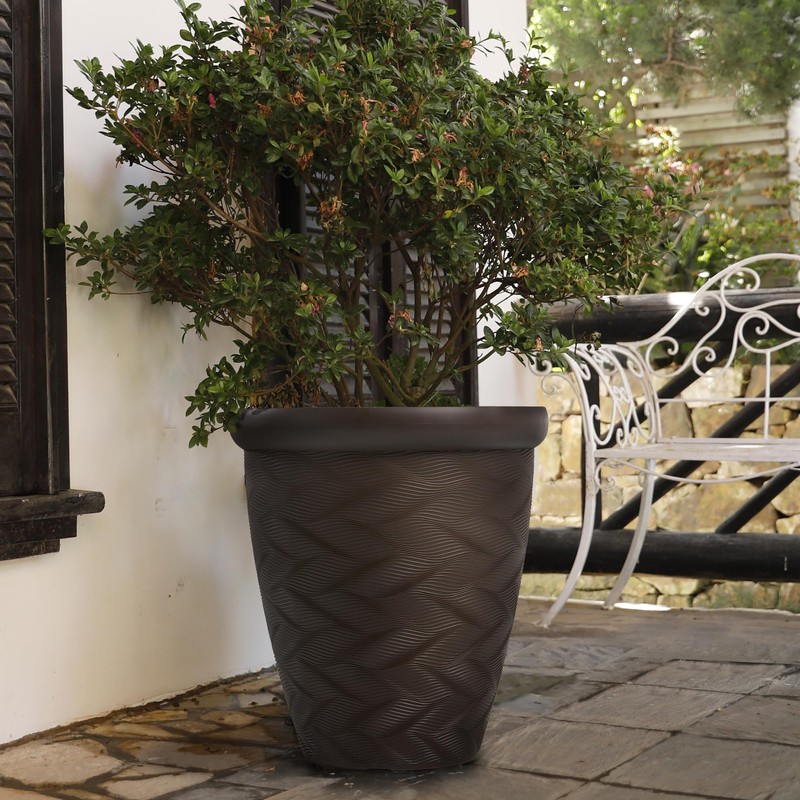 Worth Garden 2-Pack 16" Large Round Planter - Weave Pattern Lightweight Plastic Plant Pot 16" x 17.5" for Indoor Outdoor Use - Decorative Containers for Front Porch Home Yard Deck Patio - Dark Brown