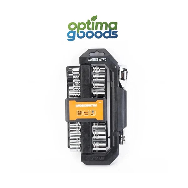 The WORX NITRO 23-Piece 1/4" & 3/8" Drive Socket Set is built for durability, precision, and convenience. Made from premium CR-V chrome alloy steel and heat-treated for strength, each tool features a mirror chrome plated finish for exceptional corrosion resistance and long-lasting performance.