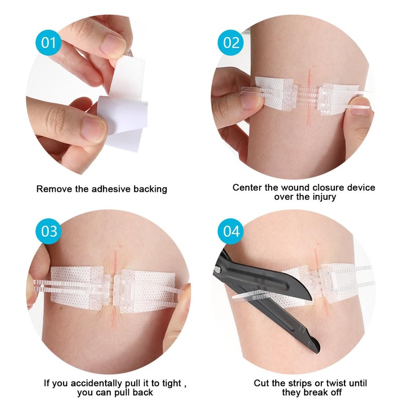 - -- Easy to use: Just stick the Sterile Skin Wound Suture Strips on the edge of the wound and tighten the zipper to complete the use. Perfect for lacerations, small cuts, grazes and minor wounds