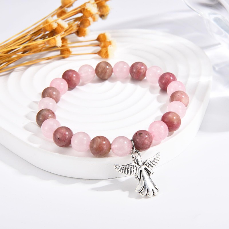 - Size: Rose Bracelet 17cm Rubber Cord Bracelet Bead 11 Pink Rhodonite Stone 8mm & 11 Pink Pink Crystals 8mm with 20mm Guardian Angel Charm