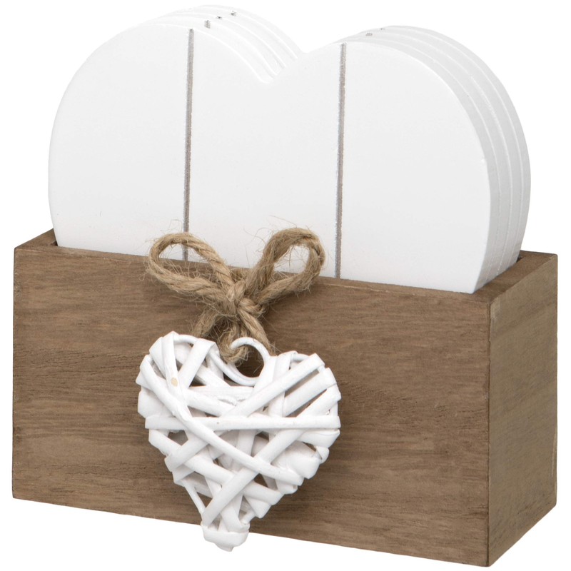 - Set of 4 wooden heart shaped coasters housed in a wooden stand. The woven heart decoration adorning the front gives a homely feel.