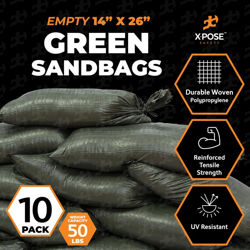 Woven Polypropylene Sand Bags for Flooding, Gravel - 14" x 26" Sacks 50 lb Weight Limit, Military Grade Reusable Refillable Sand Bag for Hurricane Flood Protection, Empty Sandbags, Green, Bundle of 10