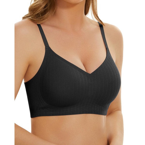 WOWENY Wireless Push Up Bras for Women Comfortable Ribbed Seamless Bralettes V-Neck Adjustable Padded Everyday Bra(Black, Medium)
