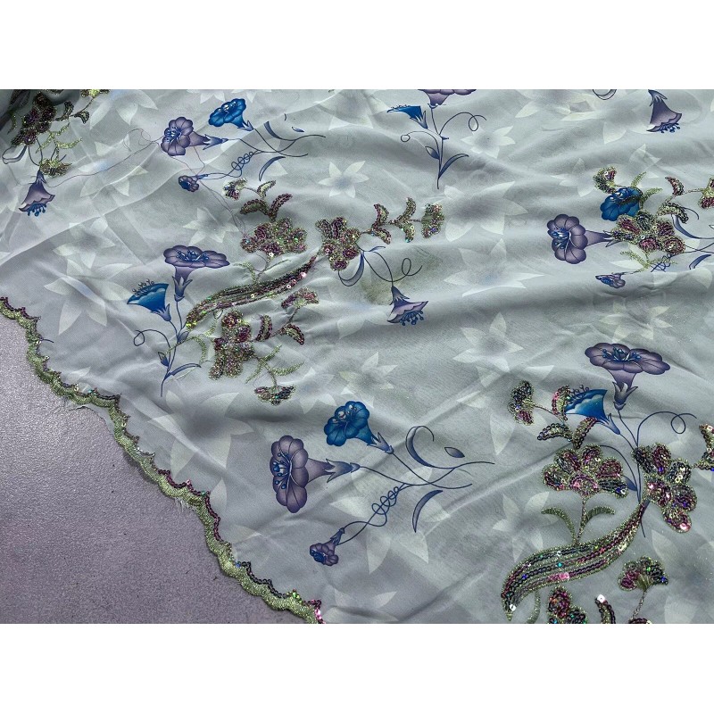 Wowfabric4less Light Blue Gold Embroidered Chiffon W/multi Sequins Fabric 50” Width 1 Yard