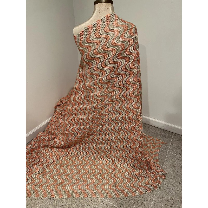 Wow atleast a 5 Yard fabric length of Peach Gold Guipure Rhinestones lace fabric is here to make your day. The fabric has a width of 50 inches and is just perfect for those special occasion dresses, prom dresses, bridal gowns or dance costumes. The fabric has a medium weight and is suitable for multiple crafts and costumes. It even features antique/vintage Metallic embroidery, embroidered design, the beauty of Rhinestones beads and the elegance of Guipure, all in one. This new fabric is sure to make your designs stand out!
