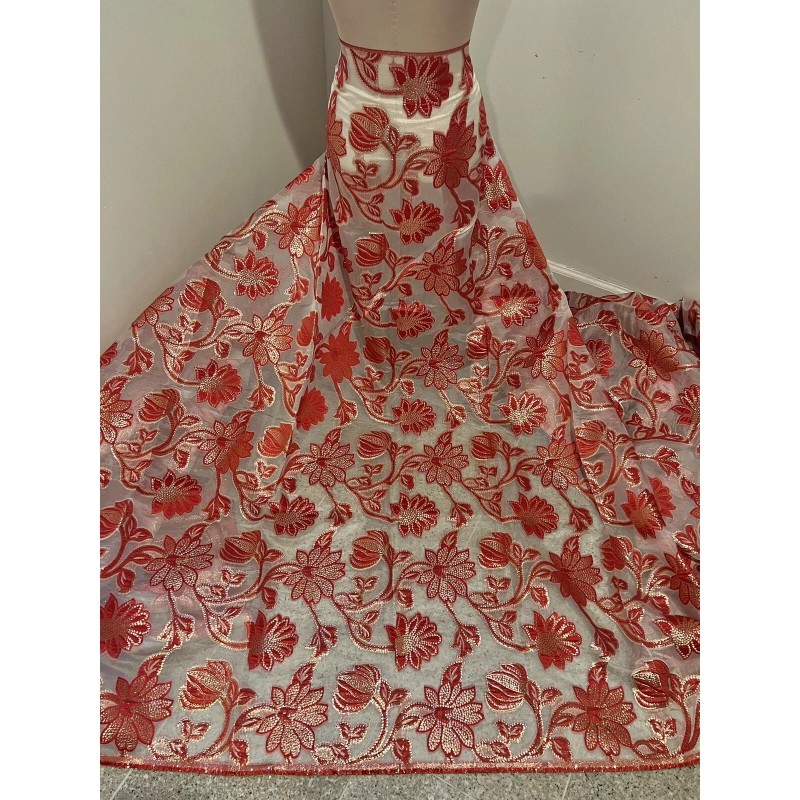 Add a touch of elegance and luxury with this beautiful RED GOLD WHITE Metallic Brocade ORGANZA Fabric. The fabric is perfect for a variety of projects, including apparel, table tops, curtains, costumes, and crafts. The floral pattern and metallic accents create a stunning and unique design that will surely catch everyone's attention.