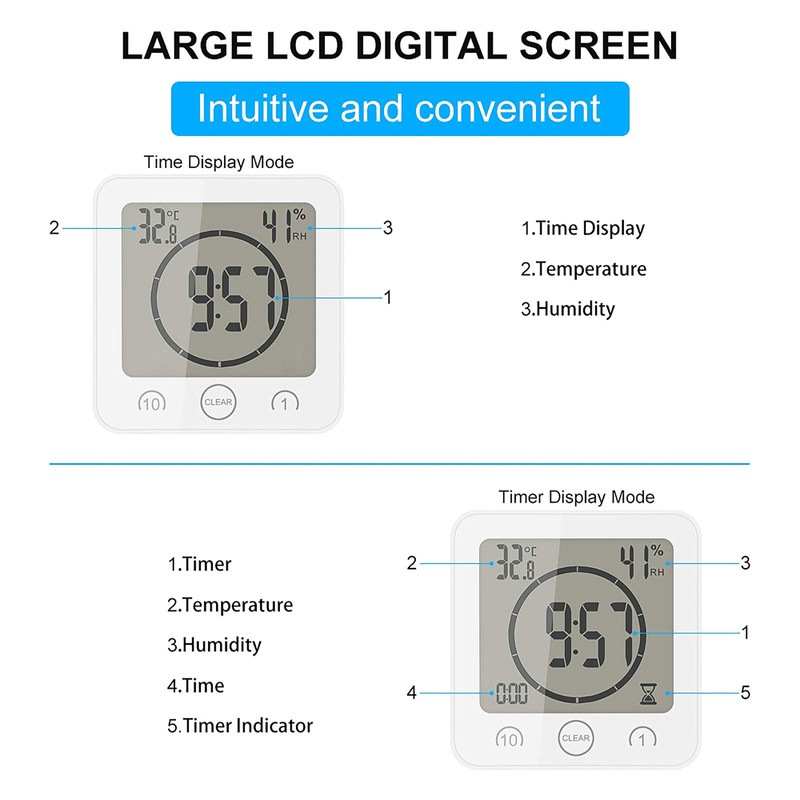 - Easy to Set Timer - Timer function makes this clock more useful, touch button control, place this slim digital suction cup timer with thermometer and hygrometer function in your bathroom. You'll know when it's time to speed things up while showering or setting makeup.