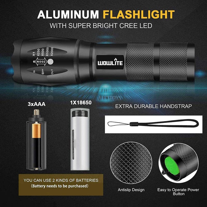 wowlite Tactical Flashlight, Wowlite Ultra Bright XML T6 LED Torch with 5 Light Modes & Adjustable Focus for Emergency Camping Hiking (2 Pack)