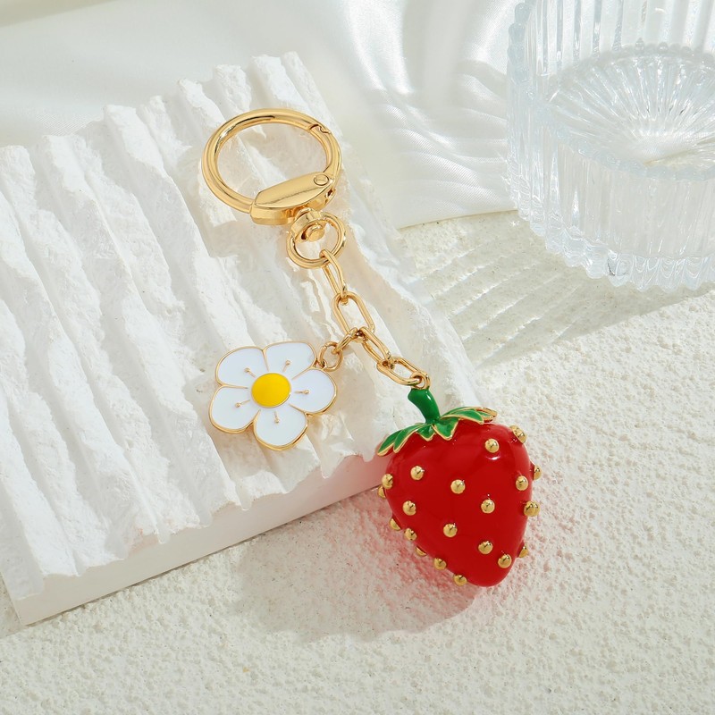 - Adorable Red Strawberry Keychain: Featuring a vibrant red strawberry and a white daisy flower, this gold keychain adds a playful touch to your keys or bags. A charming accessory that stands out and brings joy wherever you go