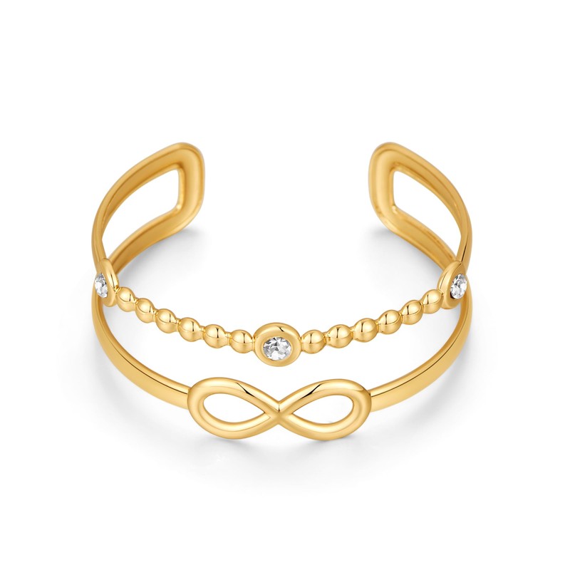 - Elegant Infinity Gold Bracelets: This layered gold bangle features a beautiful infinity symbol adorned with sparkling zircon, creating a timeless and meaningful look. perfect for elevating casual outfits or complementing evening attire
