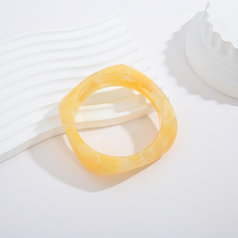 - Soft Yellow Acrylic Bangle: This women's acrylic bangle bracelet features a soft yellow marbled pattern, adding a touch of elegance to any outfit. Its stylish design makes it perfect for both casual and formal occasions