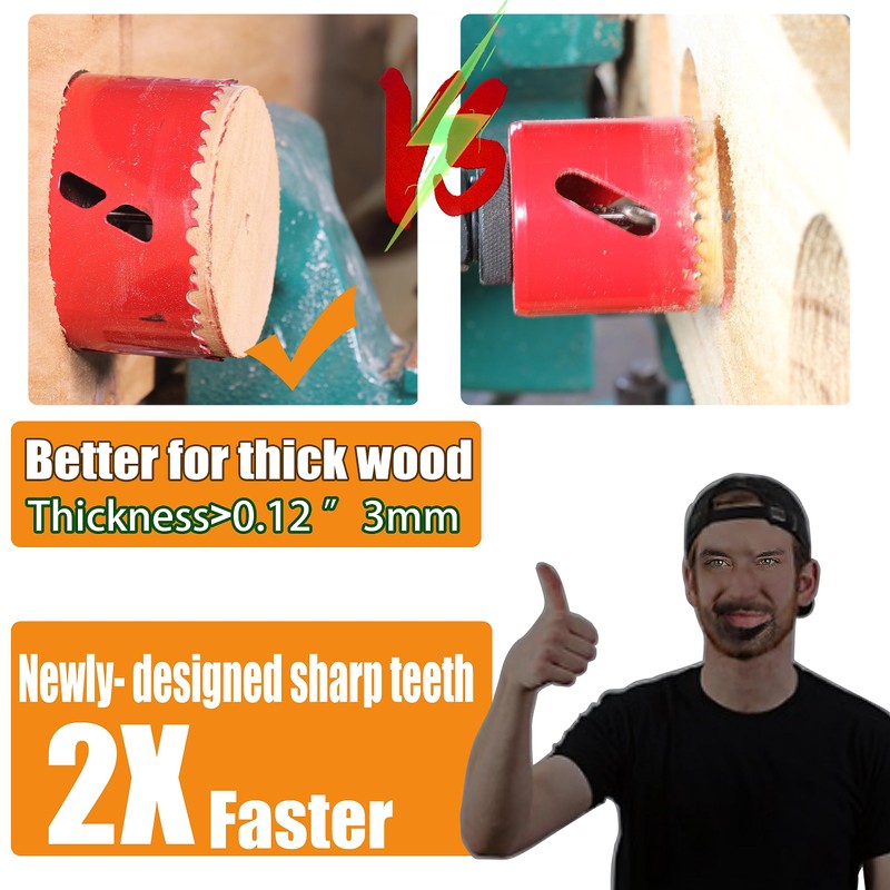 - Long Life: Can drill 30 holes (up to) in 0.12" low carbon steel plate. Be careful: It’s better for cutting the thick wood (thickness≥ 0.12”), pls lower the SPEED at the beginning, otherwise, it is easy to break teeth.