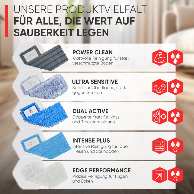 - ✅ Safe and easy to clean – especially suitable for gentle cleaning of sensitive floors such as venyl or parquet floors. The soft loops ensure a shiny and streak-free result.