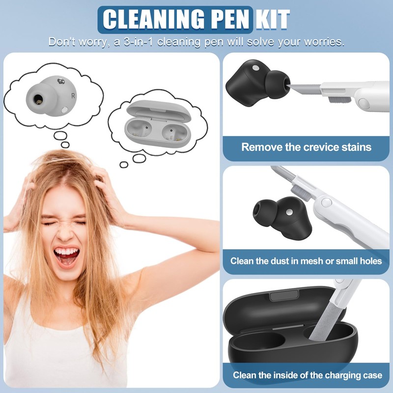 - 3-in-1 Cleaning Pen: The pen tip can remove stains from gaps, the microfiber brush can remove dust from meshes or small holes, and the flocked sponge can clean the inside of the charging box; in addition to cleaning earphones, it can also be used to clean mobile phones, keyboards, and other electronic devices.