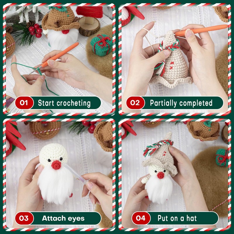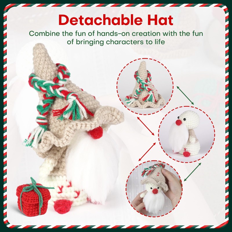 - Our Christmas decorative gnomes come to you in a set of knitted materials. If you like to craft, you have the opportunity to design your own Christmas gnome together with the family. This kit includes everything you need: needles, buttons, high quality acrylic hair and yarns and more so you can create your kids' favorite Christmas gnome stitch by stitch