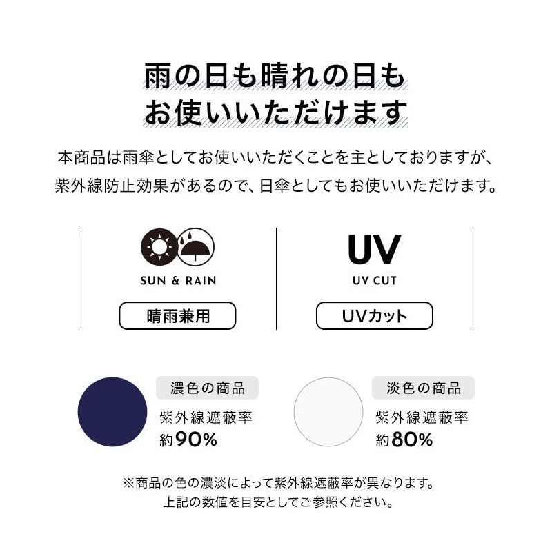 - (Rain Umbrella that can be used on sunny days) This product is mainly used as a rain umbrella, but it also has UV protection. However, the UV shielding rate (UV protection rate) varies depending on the color shaded color. Please refer to the following measurements as a guide. Light Color: Approx. 80%, Dark Color: Approx. 90%