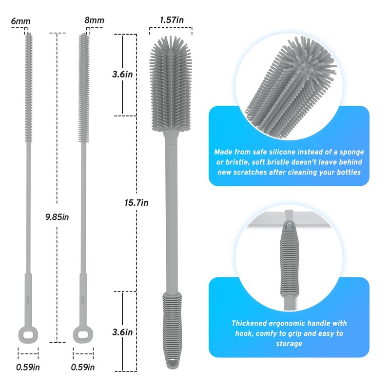 - MULTIFUNCTIONAL DESIGN: The silicone bottle brush comes with different shapes and lengths of bristles for cleaning all kinds of bottles, water bottles and straws. Whether it's a slender straw or a wide-mouthed bottle, it can be easily cleaned in place.