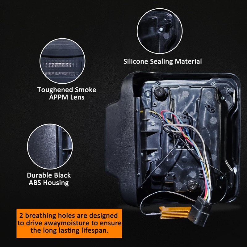 - 【Quality Construction】: Manufactured from OEM grade materials, these JL Tail Lights are assembled to precise standards for long-lasting quality. Featuring military durable black ABS plastic housings with smoked polycarbonate lenses, these Tail Lights giving optimum protection against the abuse of road debris, and impact from branches on the trail. Anti-flicker smooths out flickering signals, weather-sealed house and breathing valve prevent dirt and moisture from harming the state of the art electronics found inside.