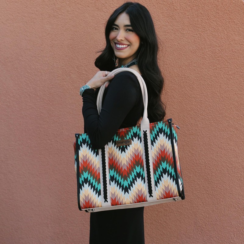 - Wrangler purse features an eye-catching aztec print and the cross-stitch woven details.