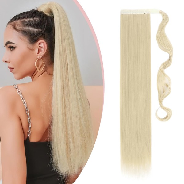 Wrap Around On Ponytail Extension Long Straight Wavy Clip In On Ponytail One Piece Synthetic Heat Resistant Magic Paste Wrap Pony Tail Hairpiece Soft Silky (26"Straight,Bleach Blonde)