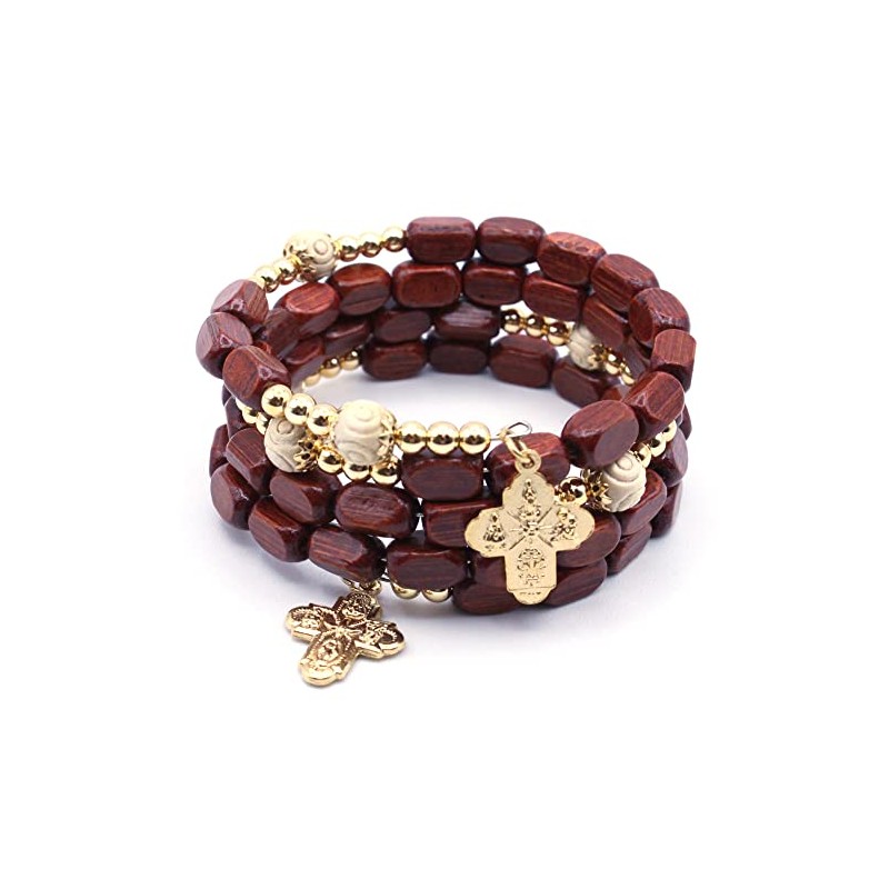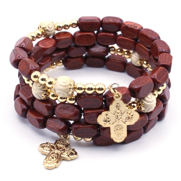 - This full Five Decade Wrap Around Rosary Bracelet is made with brown wooden cube beads on a memory wire core with gold color accents. A combination of gold tone beads and a carved wooden bead represent the Our Father bead. Two gold tone Four Way Cross charms dangle from each end of the bracelet.