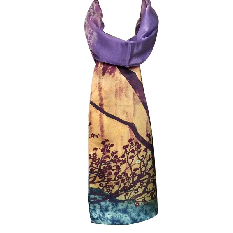 This elegant scarf features an exquisite image in vibrant and rich colors. Made from high quality 12 momme 100% charmeuse silk, the scarf has a smooth and soft-feeling touch to it, while allowing a vivid portrayal of the artwork. Mommes measures the density of silk; the higher the weight in mommes, the more durable the weave, and therefore the higher the quality. The scarf consists of a smooth and glossy front side with a soft matte side in the back. Elegant and fashionable, this scarf is the perfect finishing touch to your outfit. The scarf can be used for all seasons and occasions and also makes a beautiful gift for friends and loved ones. Our charmeuse silk scarf collection comes directly from a source that is dedicated to recreating renown oil painting pieces onto silk scarves.