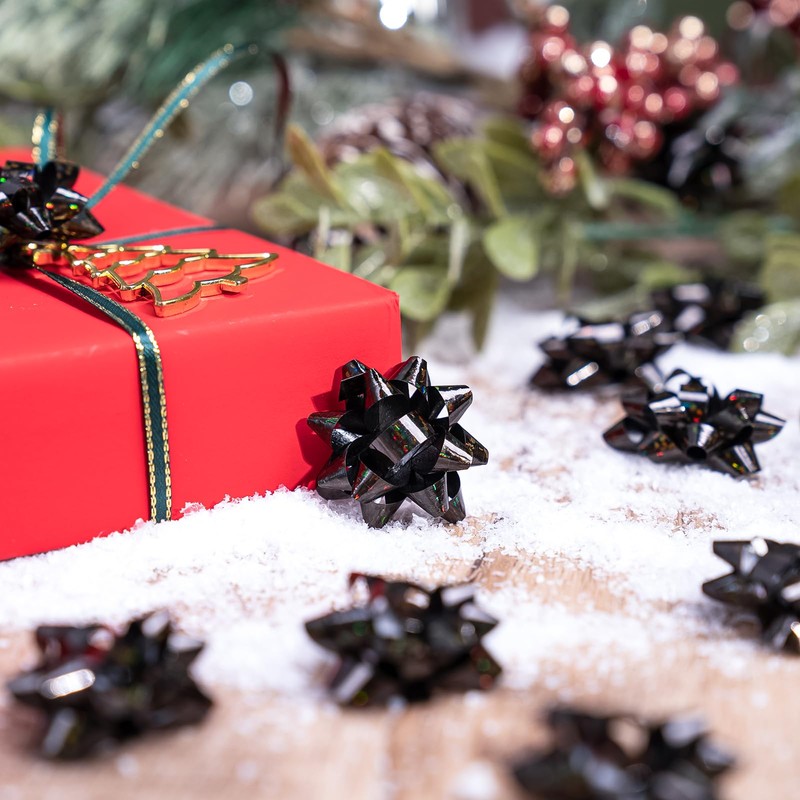 - Package: The package contains 100 pcs metallic black self-adhesive gift bows, diameter sizes 1 inch. They are packaged in a clear PVC Box for extra protection and presentation.