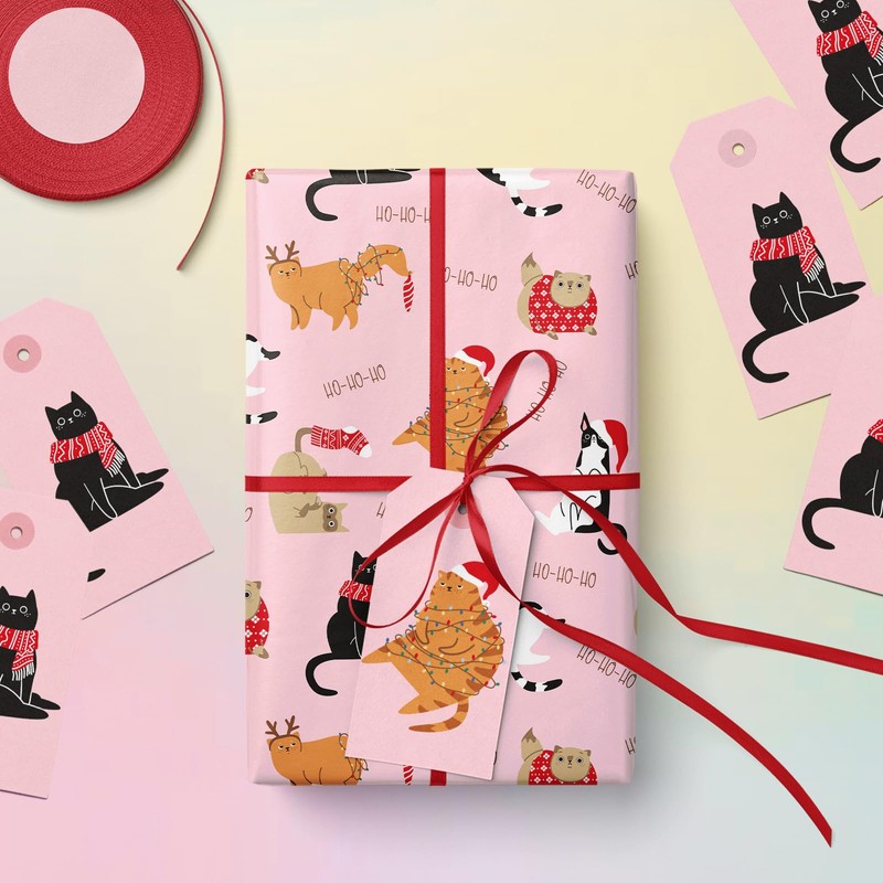 - Christmas Cat Design: Cute kitties in festive outfits and “Ho - Ho - Ho” lettering are printed on pink wrapping paper. This design creates a cheerful Christmas atmosphere and makes your gift wrapping more special.
