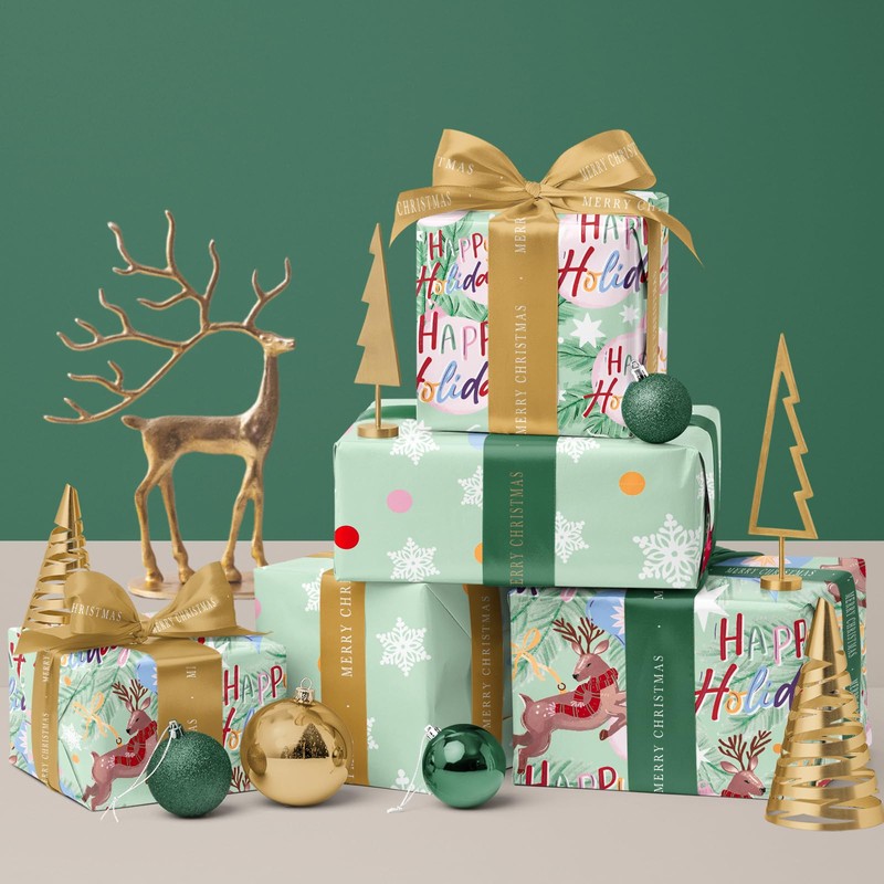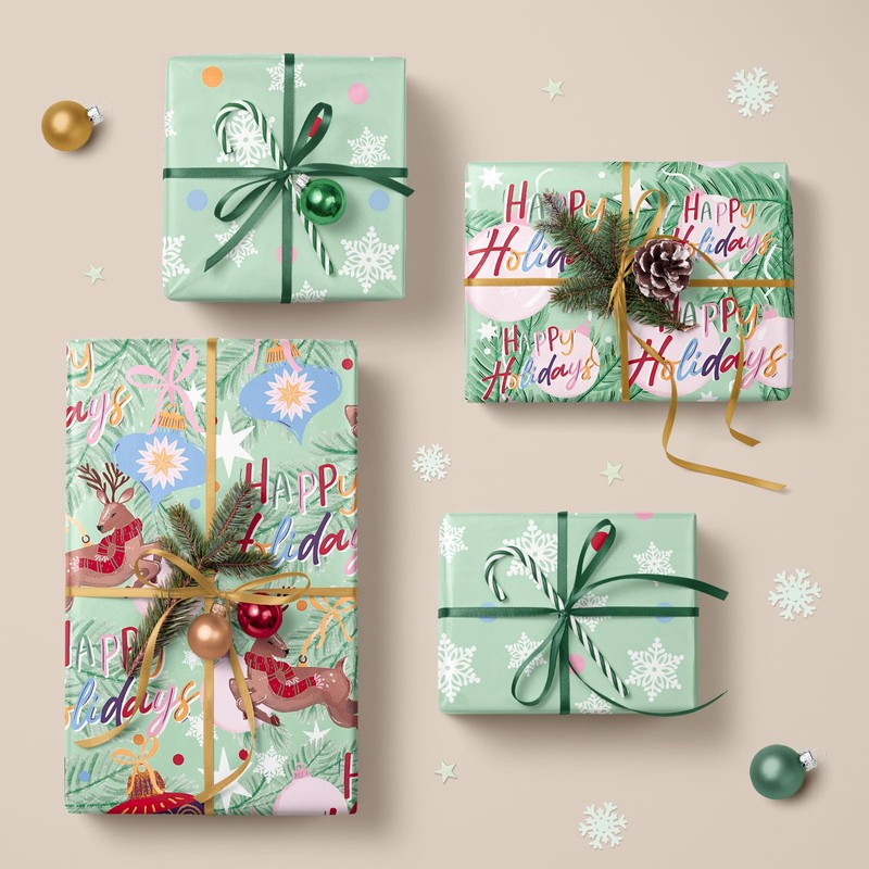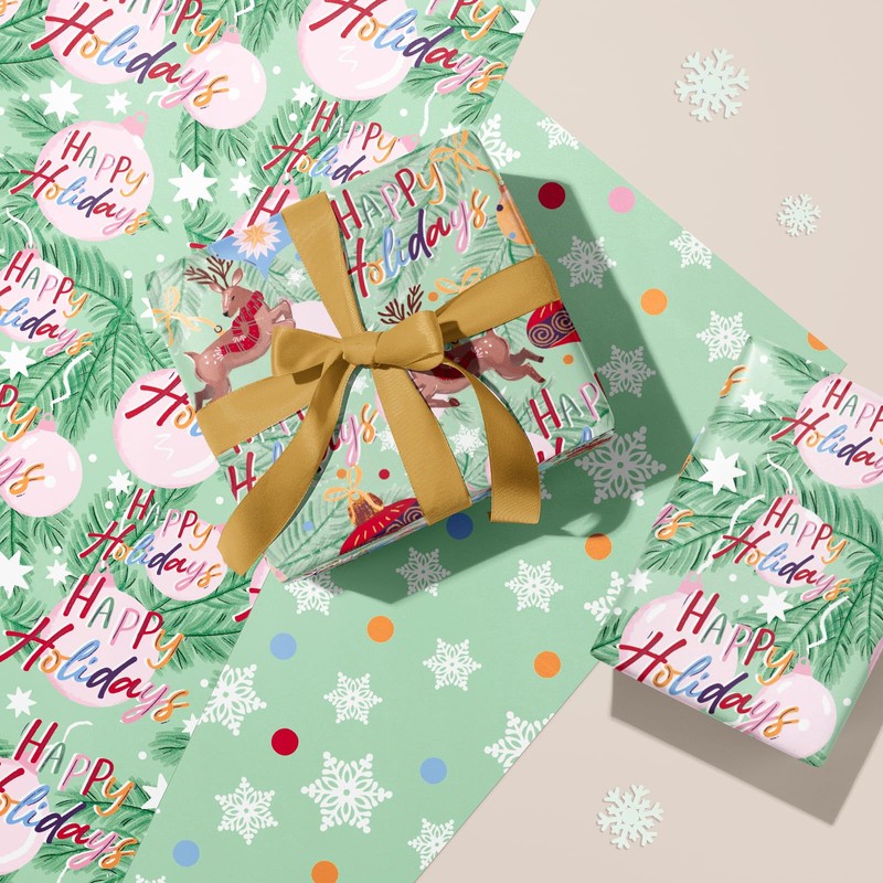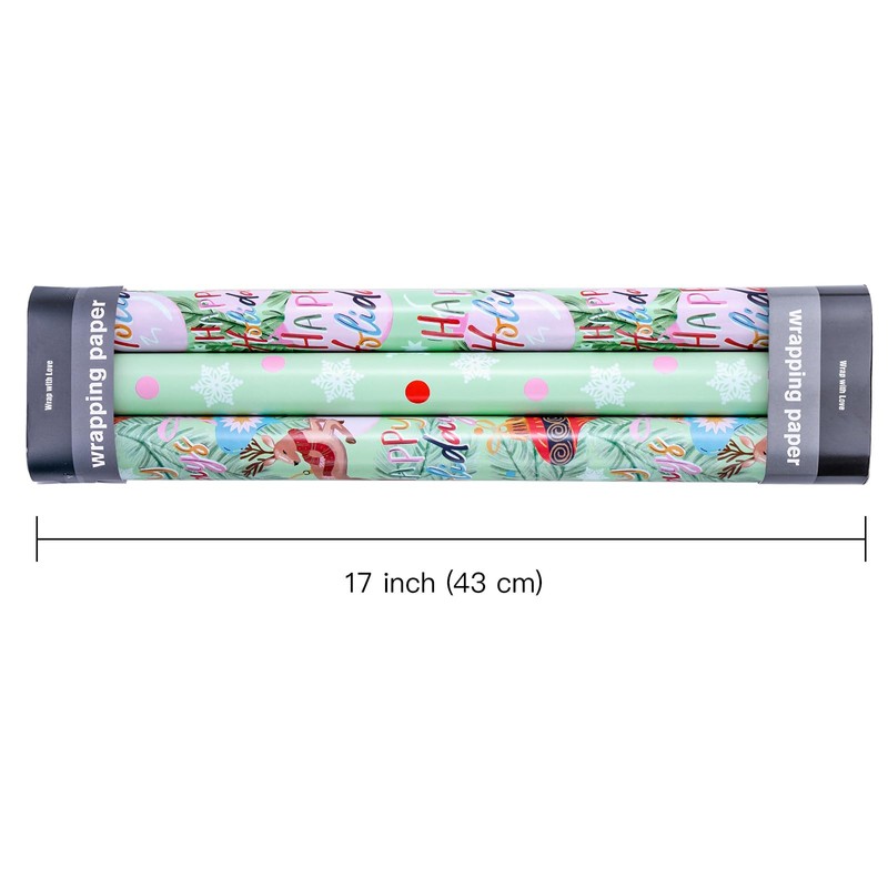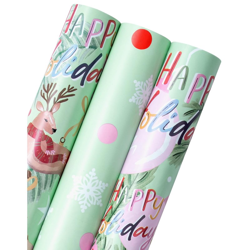 WRAPAHOLIC Christmas Wrapping Paper Roll - Mini Roll - 3 Rolls - 17 Inch X 120 Inch Per Roll - Happy Holiday Lettering with Christmas Ball and Elk, Snowflakes Holiday Collection