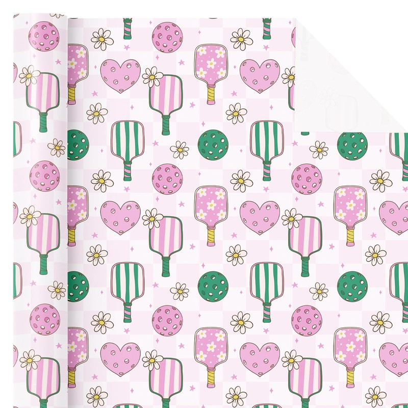 WRAPAHOLIC Preppy Pink Pickleball Wrapping Paper - Mini Roll - 17 Inch x 9.8 Feet - Pink Picklebal Paddle Girl Wrapping Paper Perfect for Girls Birthday, Sports Party, Coach Gift