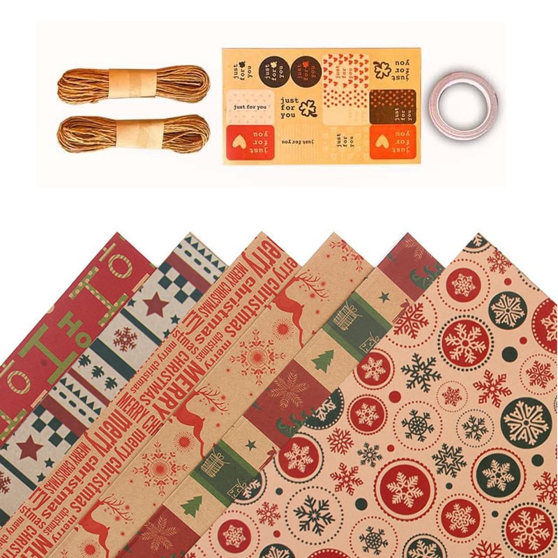 - Christmas wrapping paper set: you will receive 6 sheets of Christmas kraft paper with 10 m paper rope and 1 sheet tag, 1 double-sided tape. The wrapping paper set contains Christmas wrapping paper with sufficient accessories.