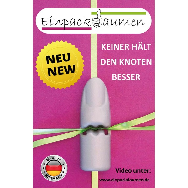 The wrapping thumb is the simple and clever solution: It just holds the first knot for you, allowing you to prepare the second one and pull it tight without any hustle. After having used it once, you will never want to miss it again. The wrapping thumb saves times, nerves, and makes gift-wrapping a child’s play.