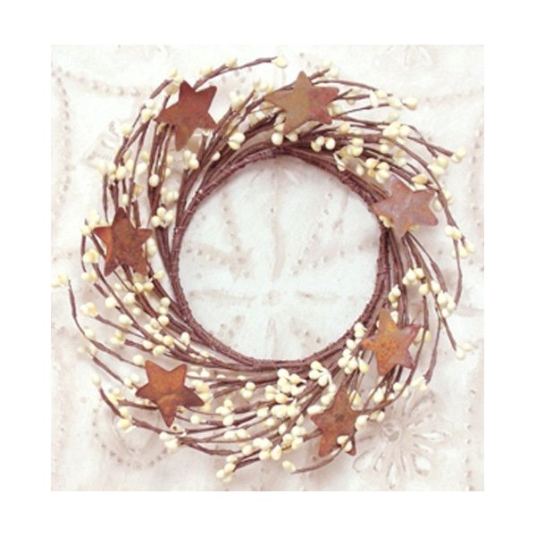 4 inch pip berry wreath with small rusty tin stars and ivory berries. 4" inside diameter, 8" outside diameter. Indoor only.