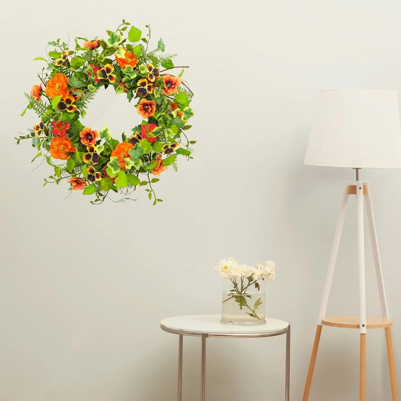 Unique Design: This Spring front door wreath is decorated with a full circle of fake Orange Poppy,pansy flower,wild rose,ivy leaves,rose leaf,fern leaves, creates a romantic look that makes for a wonderful style for spring door decoration. Elegant and vivid colors make for timeless seasonal home décor