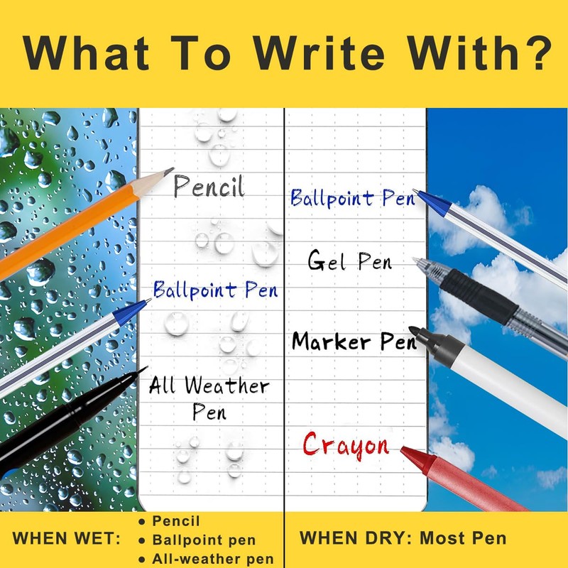 - SMOOTH WRITING: When wet, pencil / ballpoint / all-weather pen handwriting on the all-weather paper is still clear. When dry, you can use most pen, but water-based ink may take a while to dry (due to its waterproof coating).