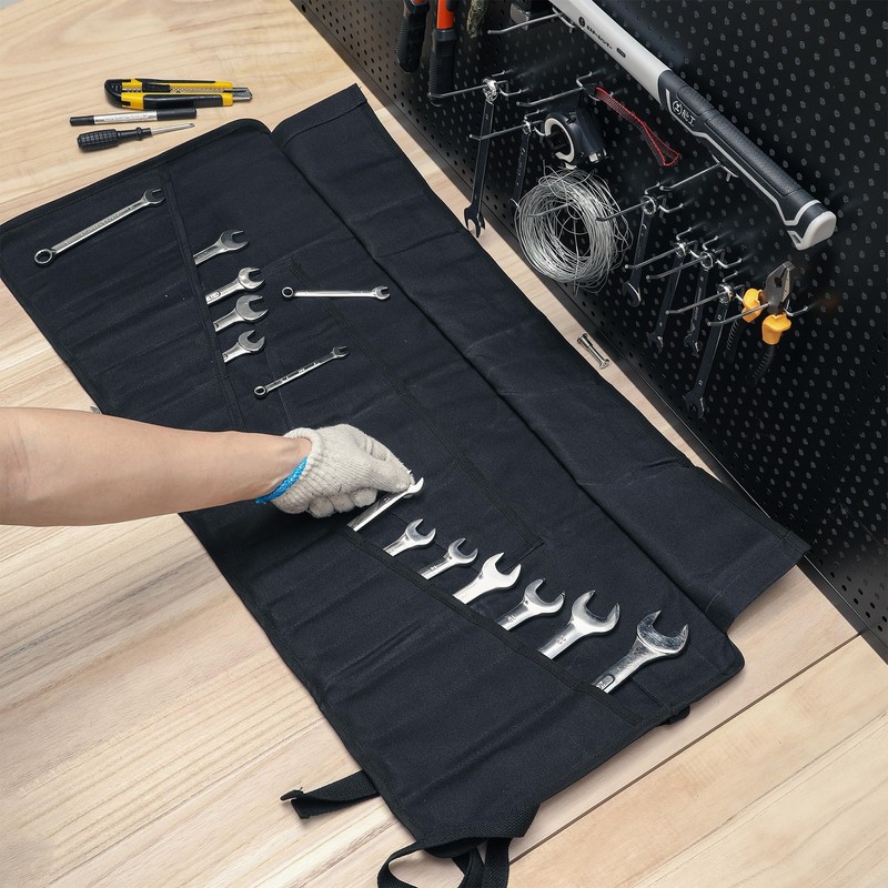 Wrench Bag Roll, Tool Storage Bag with 20 + 4 Tool Pockets, Heavy Duty 16OZ Waxed Canvas Tool Organizer for Wrench Set with Canvas Tie Rope | 84 x 34cm, Black