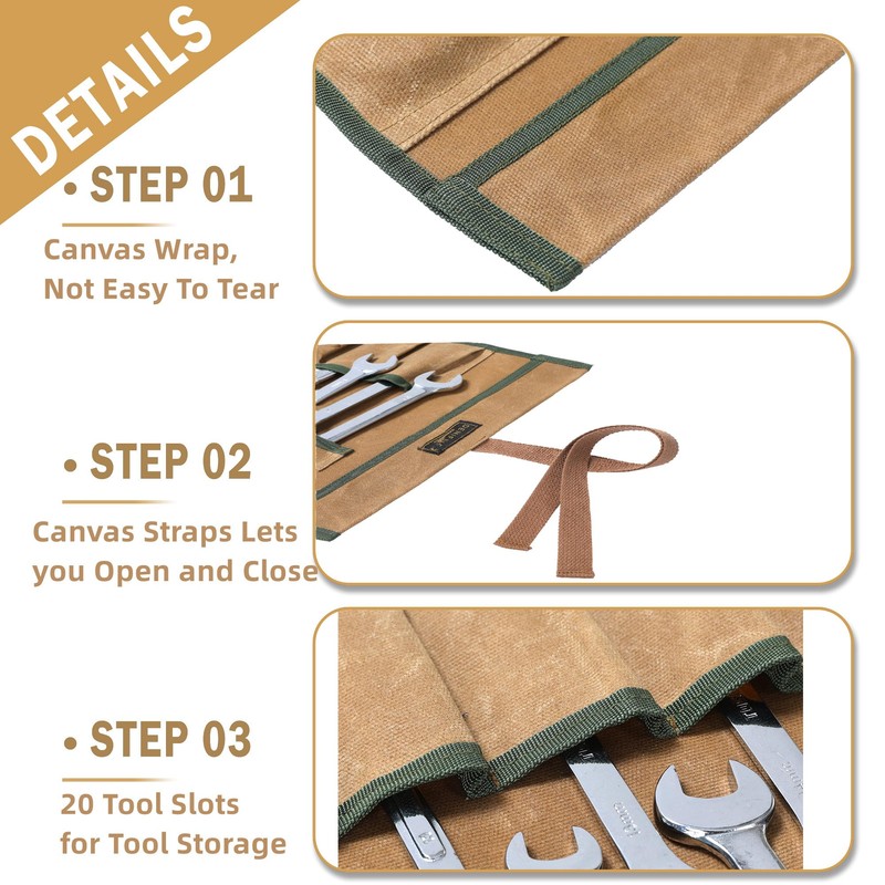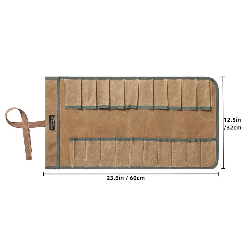 Wrench Roll, Durable 16 oz Waxed Canvas Tool Bag with 20 Slots,Tool Organizer Roll Up Bag | 23.6X12.5 Inch (Khaki)