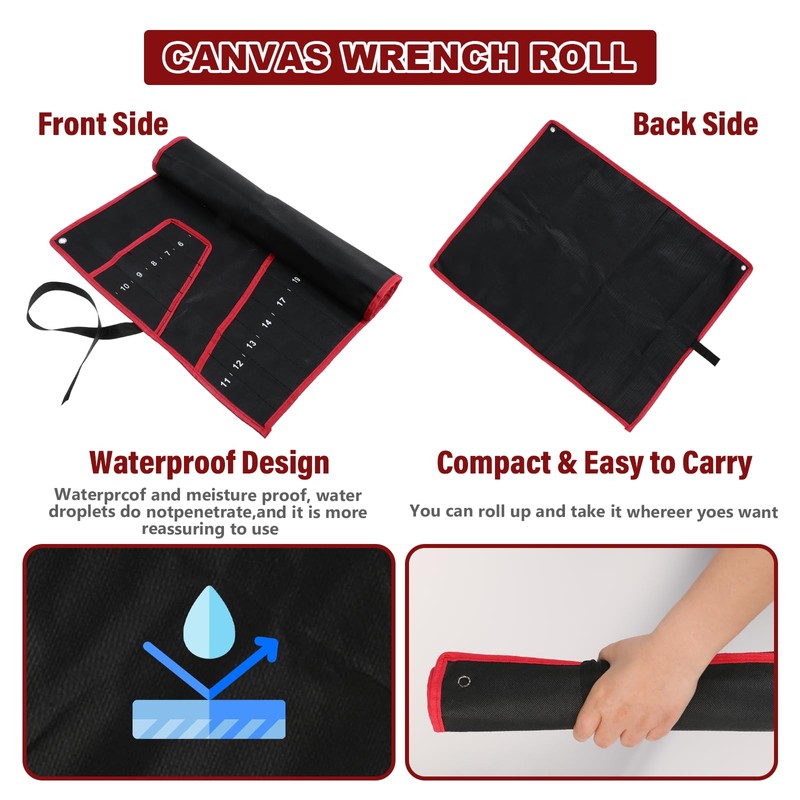 - 【Convenient Roll-Up Design】Wrench roll bag unrolled size: 22.2"L x 14"W and a rolled-up size of 14" x 2.35". Its roll-up design and closure make it easy to open the tool pouch and quickly secure it closed.