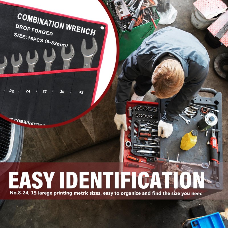 - 【Tool Roll with 16 Pockets】The tool roll up bag features 16 pockets, each marked with sizes ranging from 8mm to 24mm. The pocket sizes range from 0.87" to 1.97" in width and 3.94" to 8.27" in depth. It securely holds up to 15 combination wrenches.