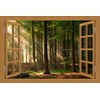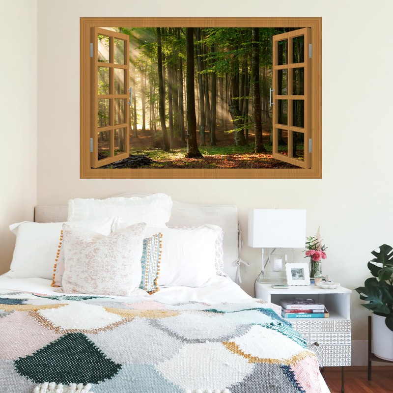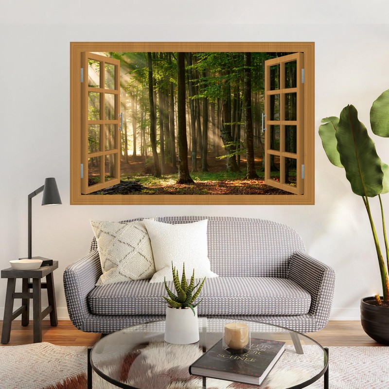 WRIGAEL Fake Window for Walls Faux Window Decal Windows Poster Picture Open Window Wall Art Decor, Stick and Peel Wallpaper Nature Wall Decol Light Forest Scene Mural, 48"x72"