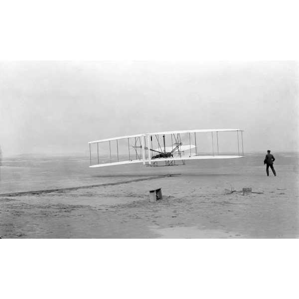 The Wright Flyer on the first successful heavier-than-air flight at Kitty Hawk, North Carolina. The first powered aircraft was designed and built by the Wright brothers, Orville and Wilbur. Orville piloting, Wilbur running at wingtip. December 17, 1903