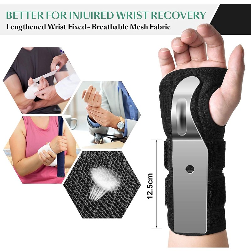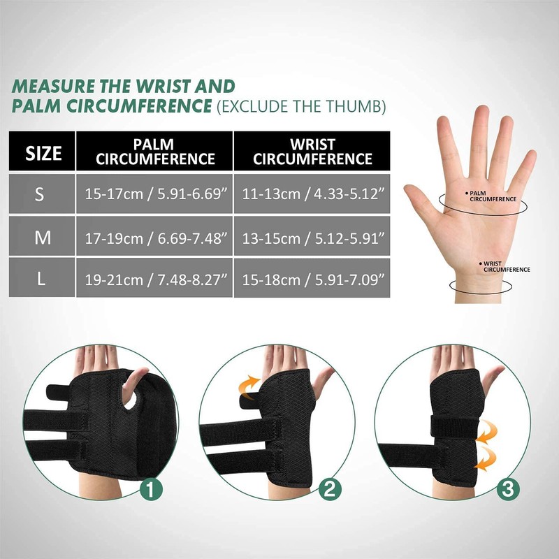 - Two extended removable splints support: the unique shape of the palm splint is designed according to the radians from the wrist to the palm, perfect fit for the wrist. The splint on the back to strengthen the fixed effect, the semi-circular design ensures that the protruding elbow on the wrist back is not pressed by the hard splint