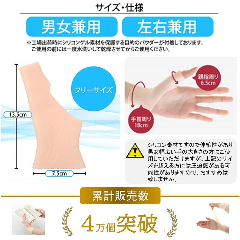 • ● Size: The Silicone Gel Wrist/Thumb Supporter is elastic and can accommodate a wrist circumference of approx. 7.1 inches (18 cm) and a thumb circumference of approx. 2.6 inches (6.5 cm), so men and women alike can use it. *Product is dusted with white powder to the silicone gel material.Please wash with water after opening.*The thumb support may detach if it is yanked too strongly when removing the supporter, so please appropriate care during the removal process.
