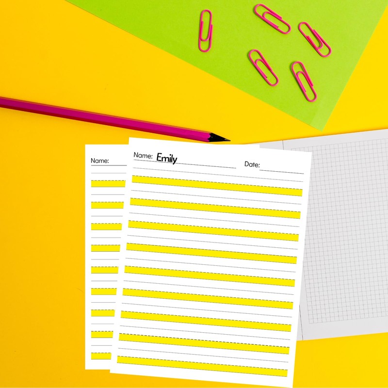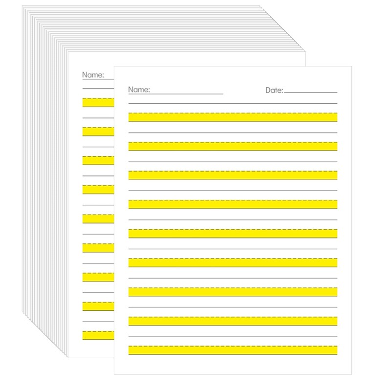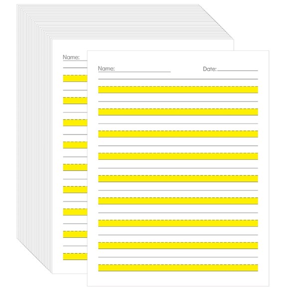 - đź“–Ideal Layout: Includes a yellow highlighted line, solid baseline and dashed midline so it's easier for students to identify the top, middle and bottom lines."Name","Date" and all the lines and middle dash lines color changed from 100% black to 60% dark grey to cut glare and decrease eye strain.