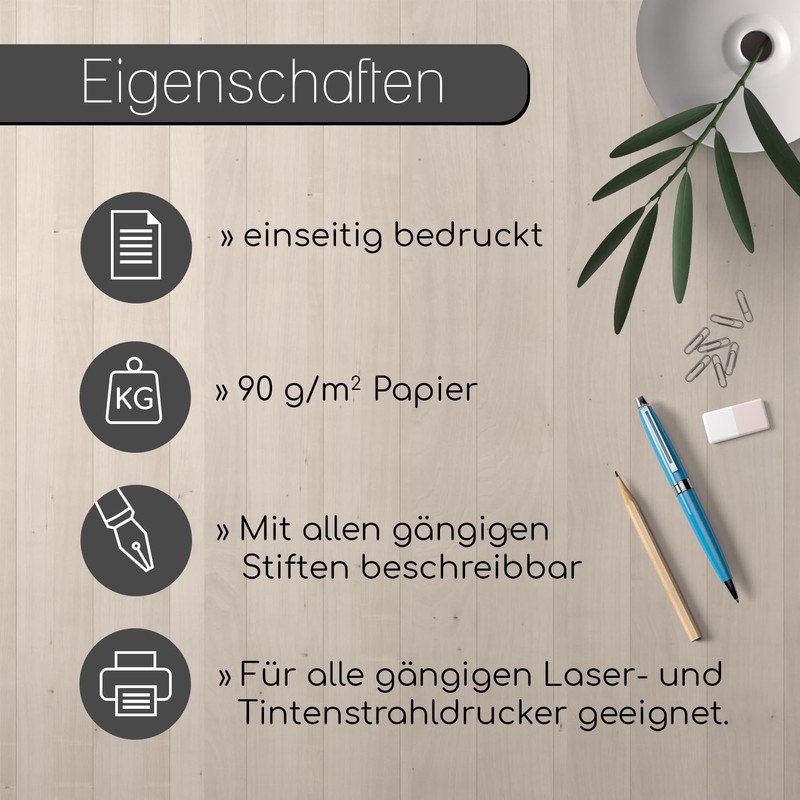 Create stylish handouts according to your wishes and needs. The writing paper is printed on one side.