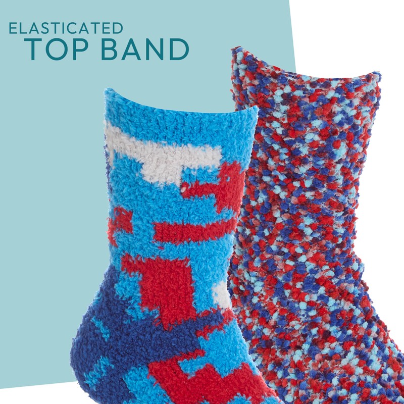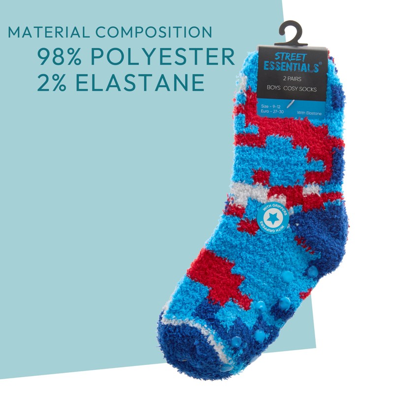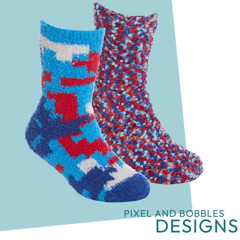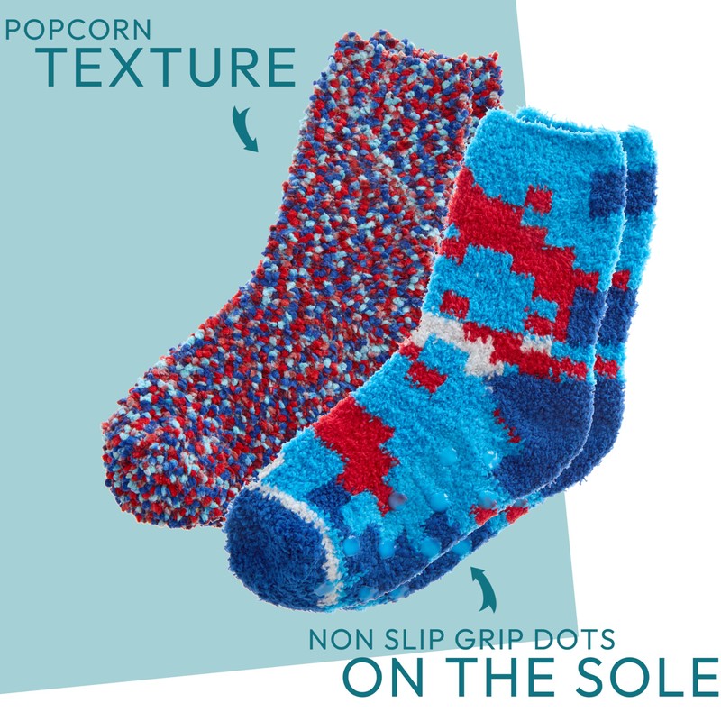 WS-AW23 Boys 2 Pairs Fluffy Snuggle & Popcorn Socks Cosy Bed Socks Non Slip Pixel Designs Blue 9-12